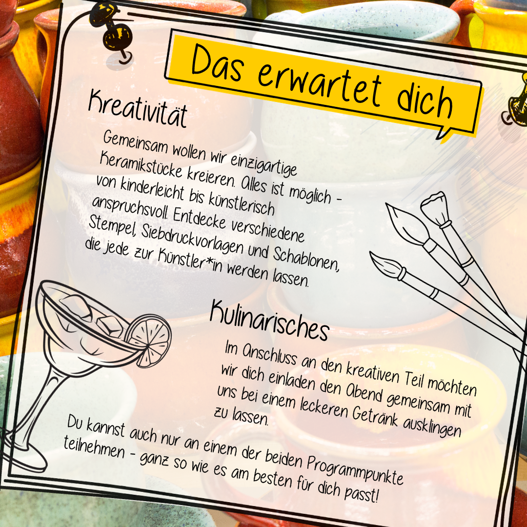 Gemeinsam wollen wir kreativ werden, tolle Keramik-Stücke individuell gestalten und nebenher ganz gemütlich schnacken. Im Anschluss gibt es noch die Möglichkeit gemeinsam Cocktails schlürfen zu gehen.